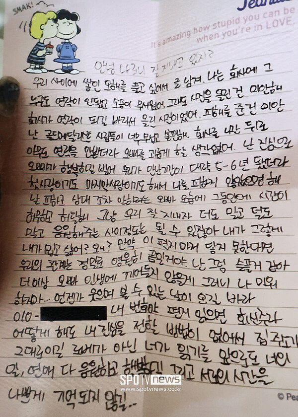 유족 측이 공개한 또 다른 자료는 故 김새론이 내용증명을 받고 지난해 4월 작성한 편지다. 공개된 고인의 자필 편지에서는 “우리가 만난 기간이 대략 5~6년이 됐더라. 첫사랑이기도 마지막 사랑이기도 해서 나를 피하지 않았으면 해”라는 내용이 담겨있어 유족 측이 주장한 2015년 열애-2021년 결별에 힘을 실었다. 변호사는 “내용 증명을 받고 난 뒤 지난해 4월 초에 전달하려고 했는데, 아파트가 아무나 들어갈 수 없는 곳이라 전달하지 못했다”라고 설명했다.